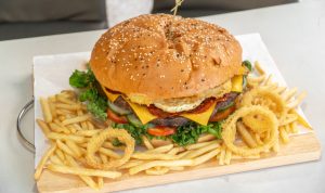 Jumbo Beef Burger Combo Plate: Hanya IDR 570.000 nett, nikmati burger daging sapi premium dengan tekstur juicy yang dipadukan dengan keju leleh, sayuran segar, dan saus istimewa racikan Chef HARRIS. Disajikan dengan kentang goreng renyah dan pelengkap lainnya, burger raksasa ini siap memuaskan 4-5 orang sekaligus.