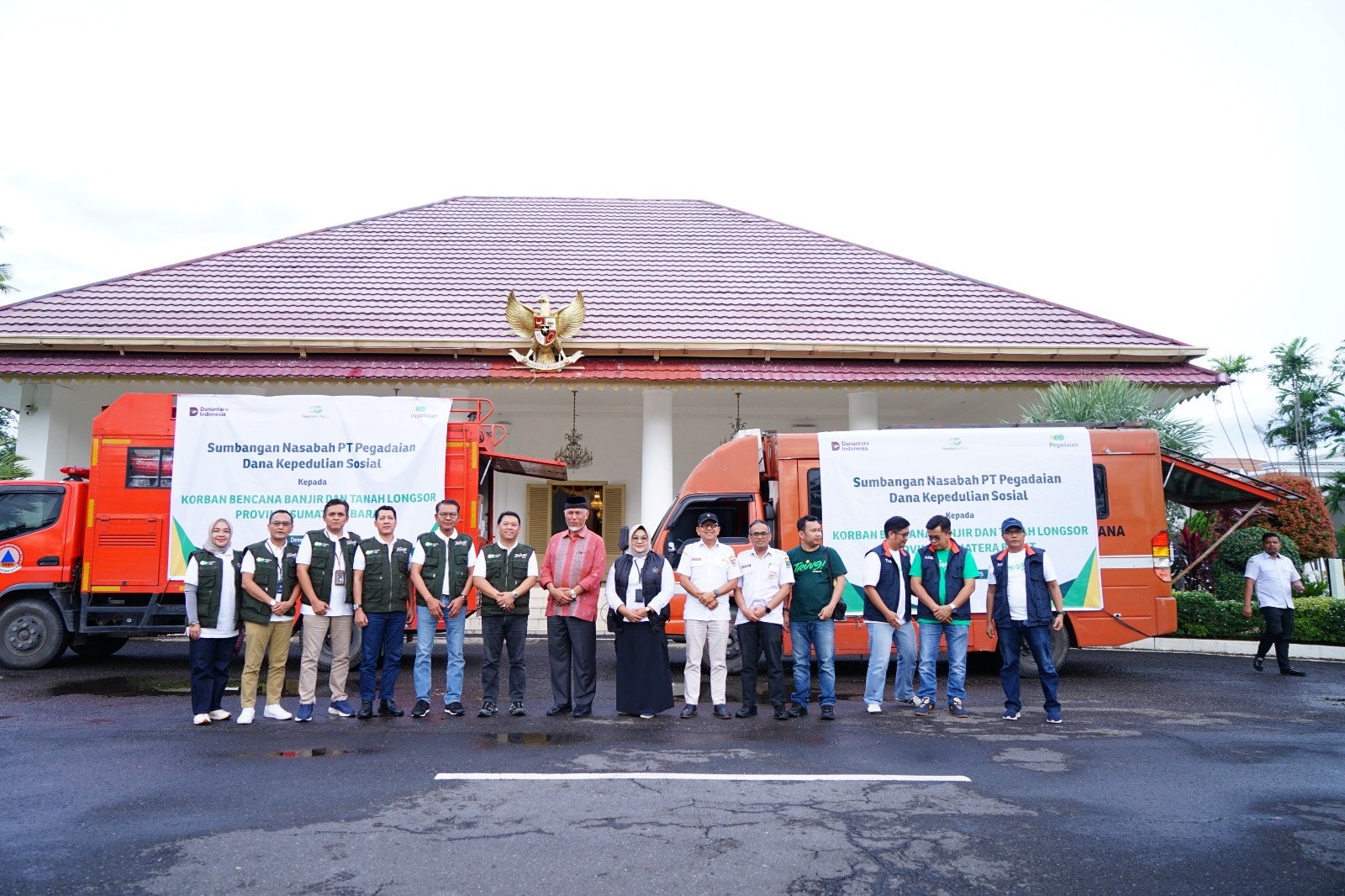 Penyerahan bantuan dilakukan secara simbolis di Istana Gubernur Provinsi Sumbar pada 10 Desember 2025. Bantuan diserahkan langsung oleh Wakil Direktur Utama PT Pegadaian, Budi Wahju Soesilo, dan Direktur Manajemen Risiko Legal Kepatuhan dan Umum PT Pegadaian, Ismail Ilyas, dan diterima oleh Gubernur Sumbar, Mahyeldi Ansharullah.