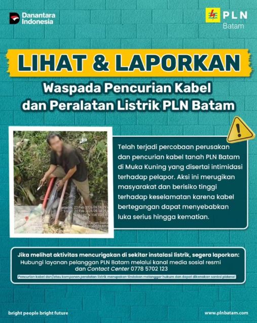 PLN Batam meminta warga segera melaporkan aktivitas mencurigakan di sekitar instalasi listrik agar penanganan dapat dilakukan cepat dan gangguan layanan diminimalkan. Laporan dapat disampaikan melalui akun media sosial resmi PLN Batam atau layanan Contact Center di nomor 0778 5702 123.