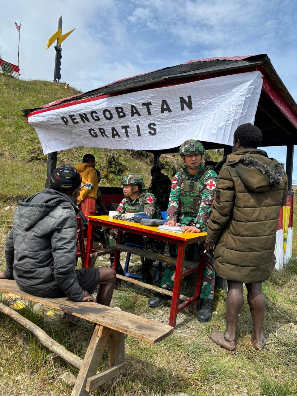Dengan membawa perlengkapan medis sederhana, obat-obatan, vitamin, serta peralatan pemeriksaan dasar, personel Satgas memberikan tempat layanan kesehatan pengobatan gratis bagi warga distrik nume untuk memberikan pelayanan kesehatan secara langsung.
