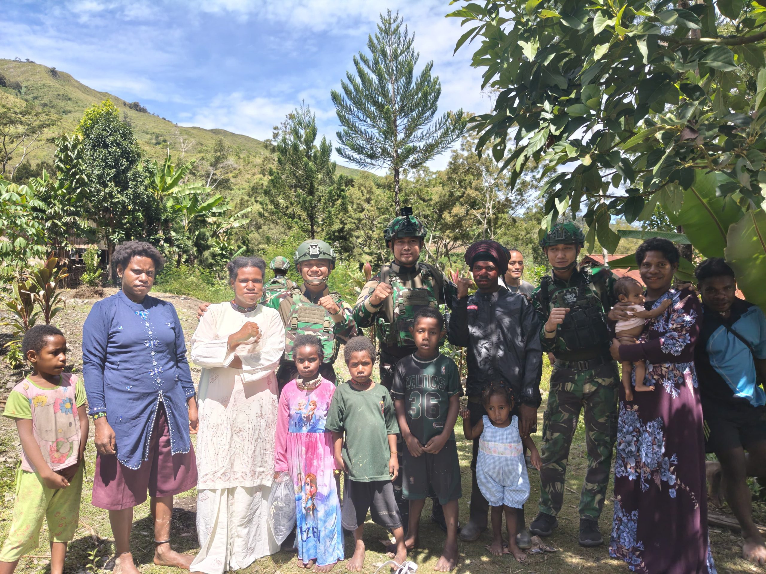 PAPUA — Dalam hangatnya kebersamaan di tanah pegunungan Papua, kepedulian hadir menyapa dari hati ke hati, mempererat tali persaudaraan antara prajurit dan rakyat. Kegiatan tersebut menyasar kediaman Bapak Elek (40), yang disambut dengan penuh kehangatan dan rasa kekeluargaan.